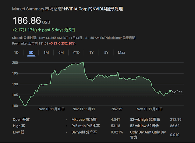 然而AI是否泡沫的争议也一直不断,最近一周反而加强了,影响也开始显现,NVIDIA股价已经连跌几天,今天美股盘前又跌了3%。